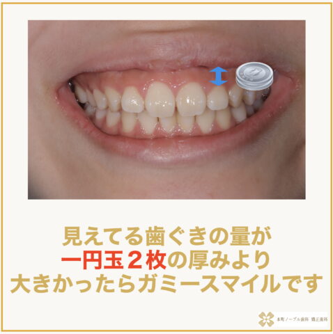 見えてる歯ぐきの量が一円玉2枚の厚みより大きかったらガミースマイルです。
