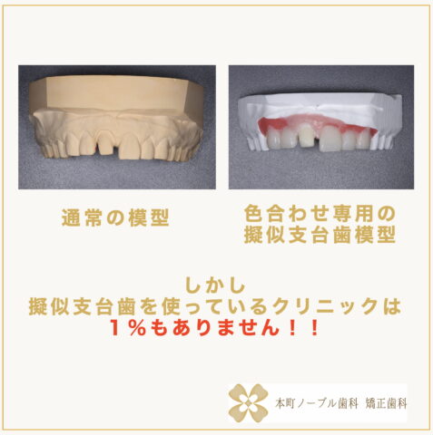噛み合わせや神経を保存をする為にセラミックが薄くて土台の色が影響する可能性がある場合『擬似支台歯』を使ってセラミックの色合わせを行います。