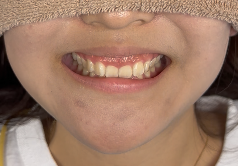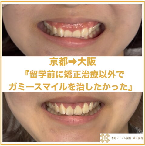 留学前で時間が限られているが、前歯が2本垂れ下がっているガミースマイルを矯正以外の方法で治したい 患者様が京都からご来院されました。