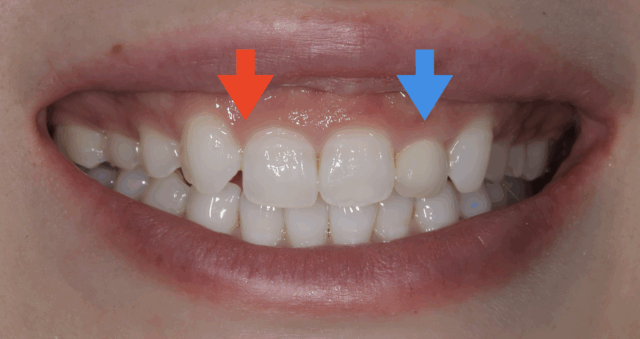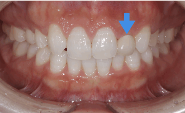 反対側の歯は元々小さかったので過去に被せ物で大きく治療されていました(青矢印)シミュレーション用マウスピース