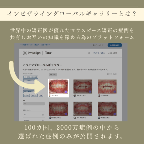 グローバルギャラリーとは世界中の矯正医が優れたマウスピース矯正の症例を共有しお互いの知識を深める為のプラットフォームです。