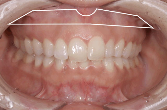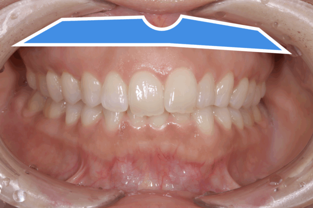 前歯にセラミックが入っているので、セラミックを外さず治療できるリップリポジショニングで治療