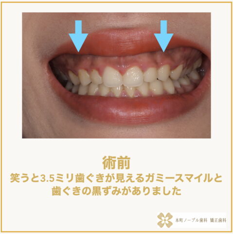実際、笑うと3.5ミリ歯茎が見えるガミースマイルでした。また歯茎に黒ずみもありました。