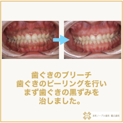 歯冠長延長術の検査時に歯ぐきのピーリング(ガムブリーチ、歯ぐきのブリーチ)を行い歯ぐきの黒ずみを治しました。
