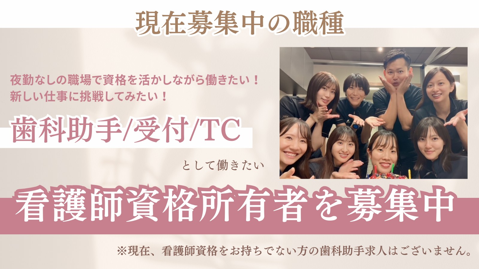 | 募集職種 | 歯科助手・受付・トリートメントコーディネーター(常勤) |